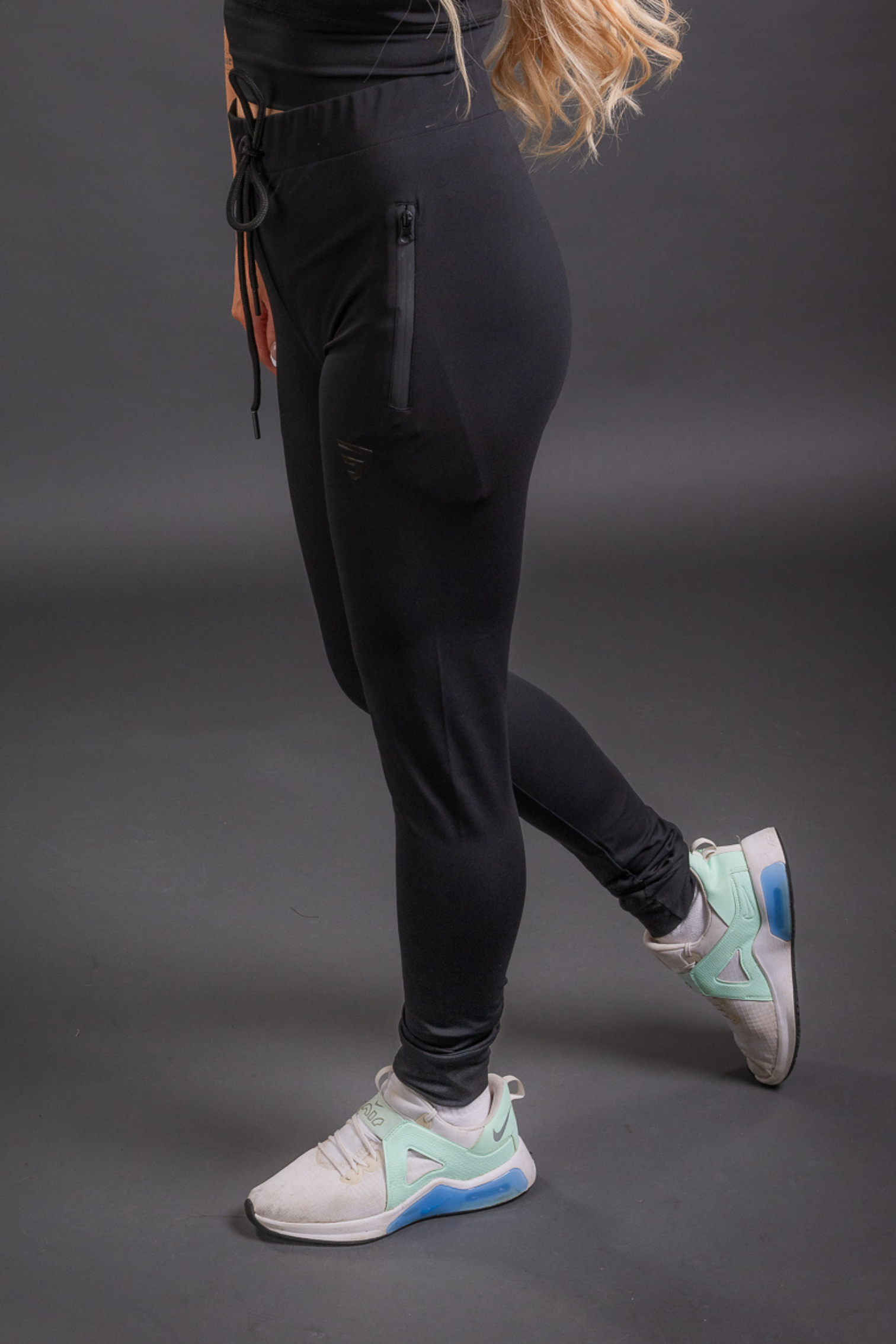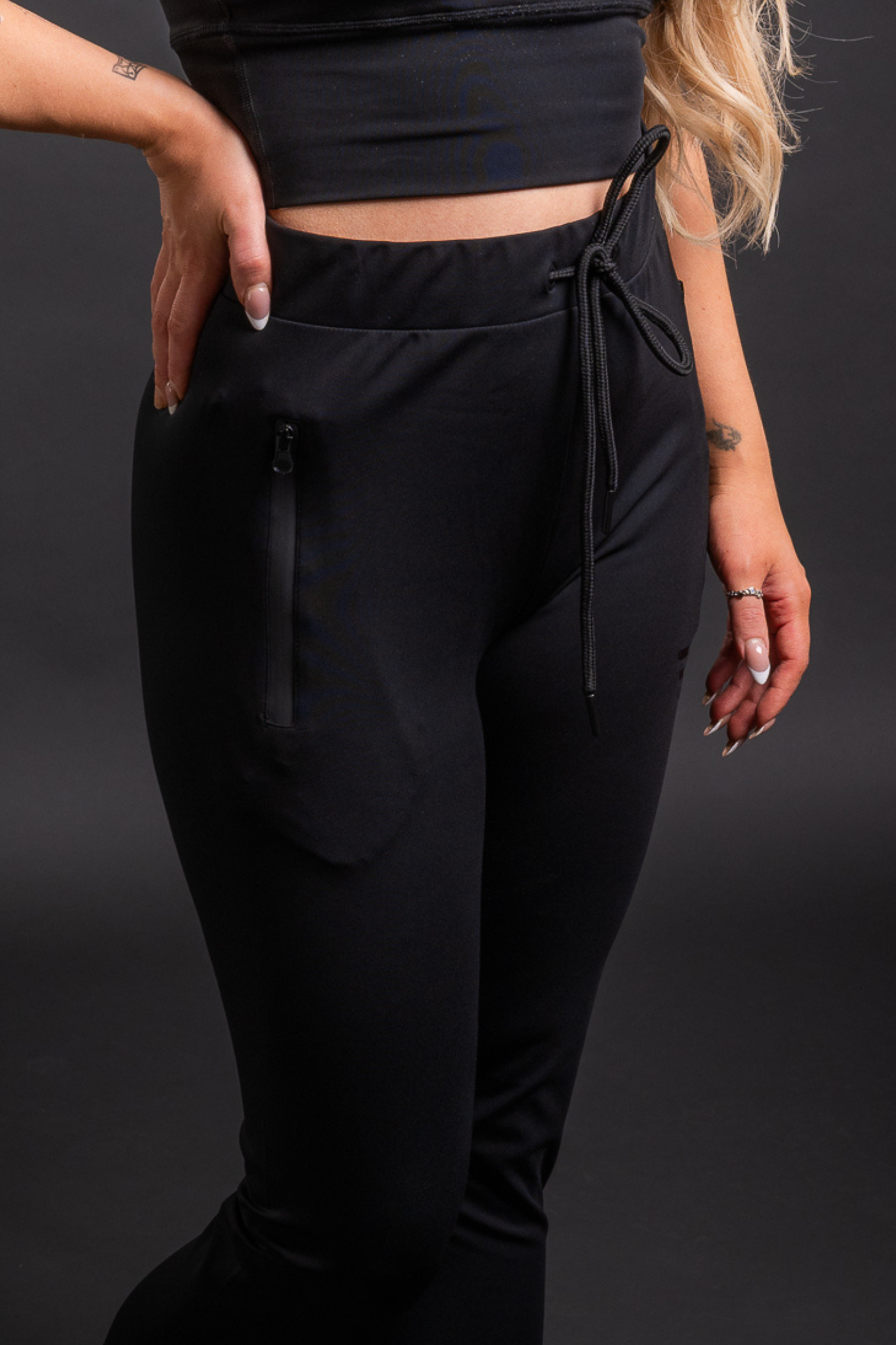 Kolsvartar leggings joggerbuxur með renndum vösum úr mjúku og þægilegu efni.